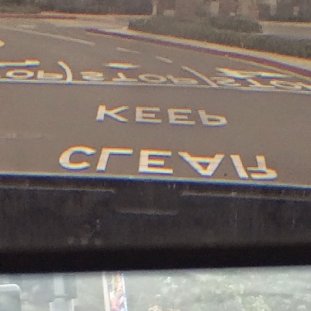 I had a weird view of the road on my drive to drop Kate off at school–what letters are and are not backward in the rear view mirror did not seem correct.