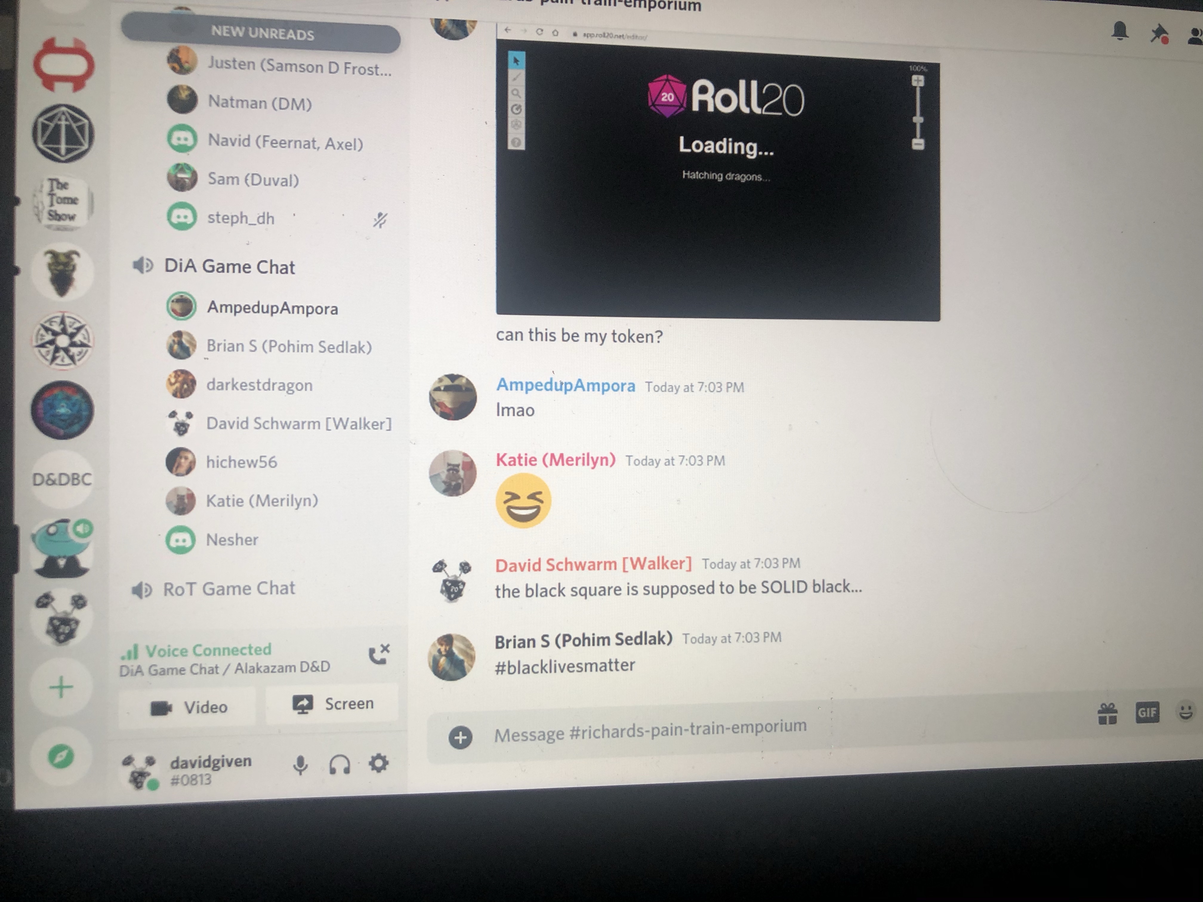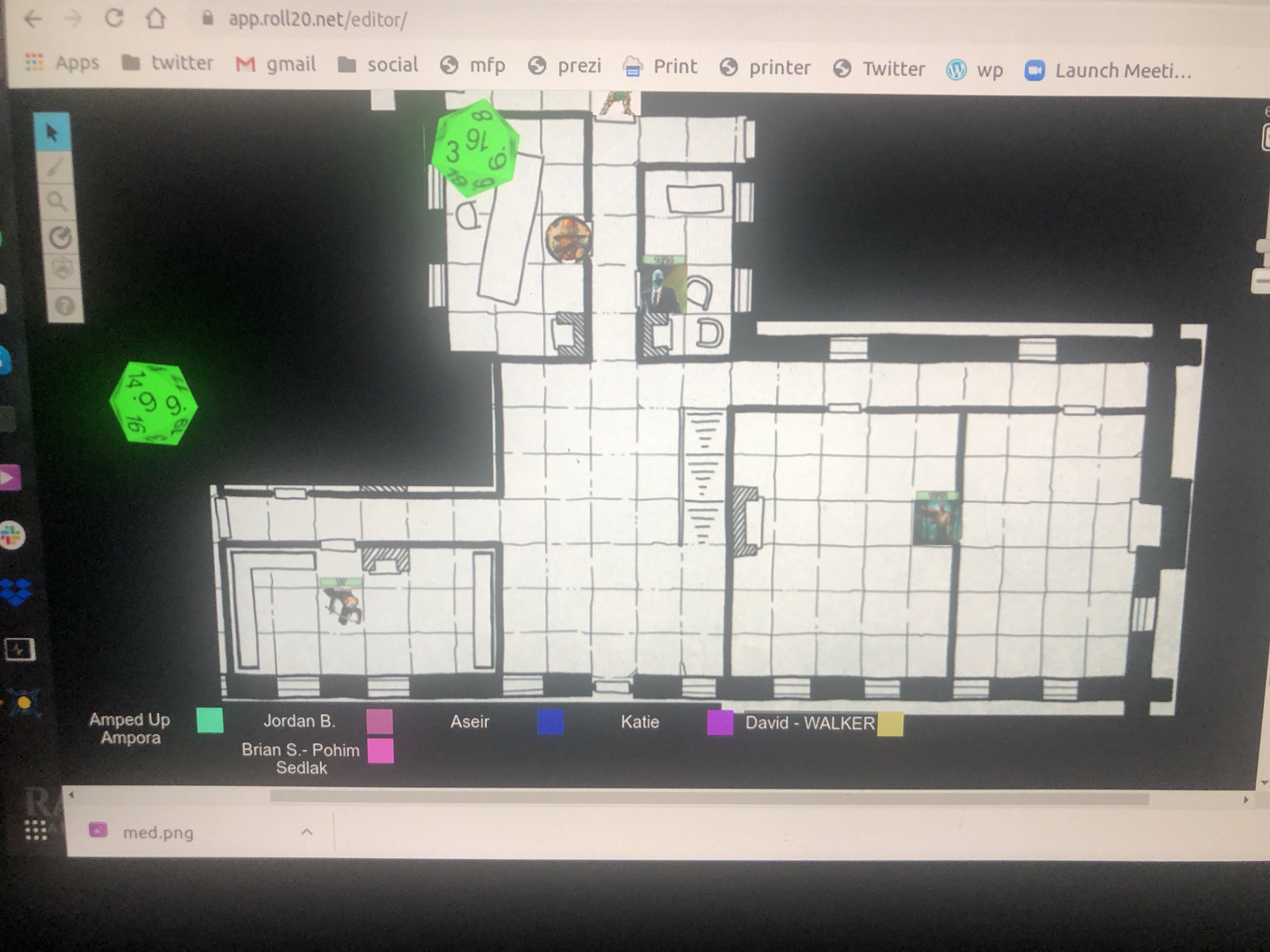 The party spends a lot of time in crazy chat conversations–Brian was having trouble connecting & tried to set the ROLL20 Loading Page as his character avatar / token.