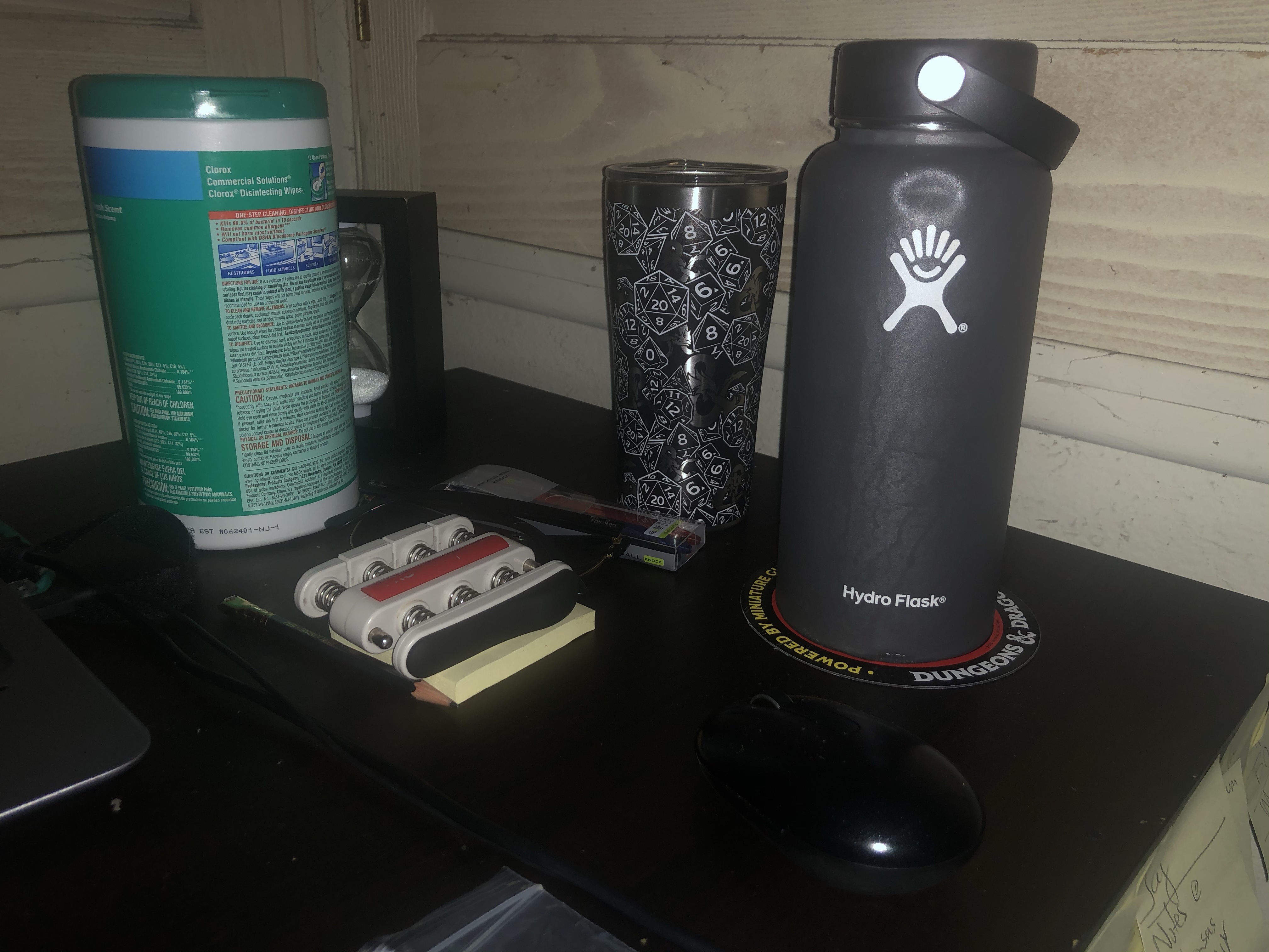 Here is my setup for the current campaign–small laptop monitor with lots of fluids!