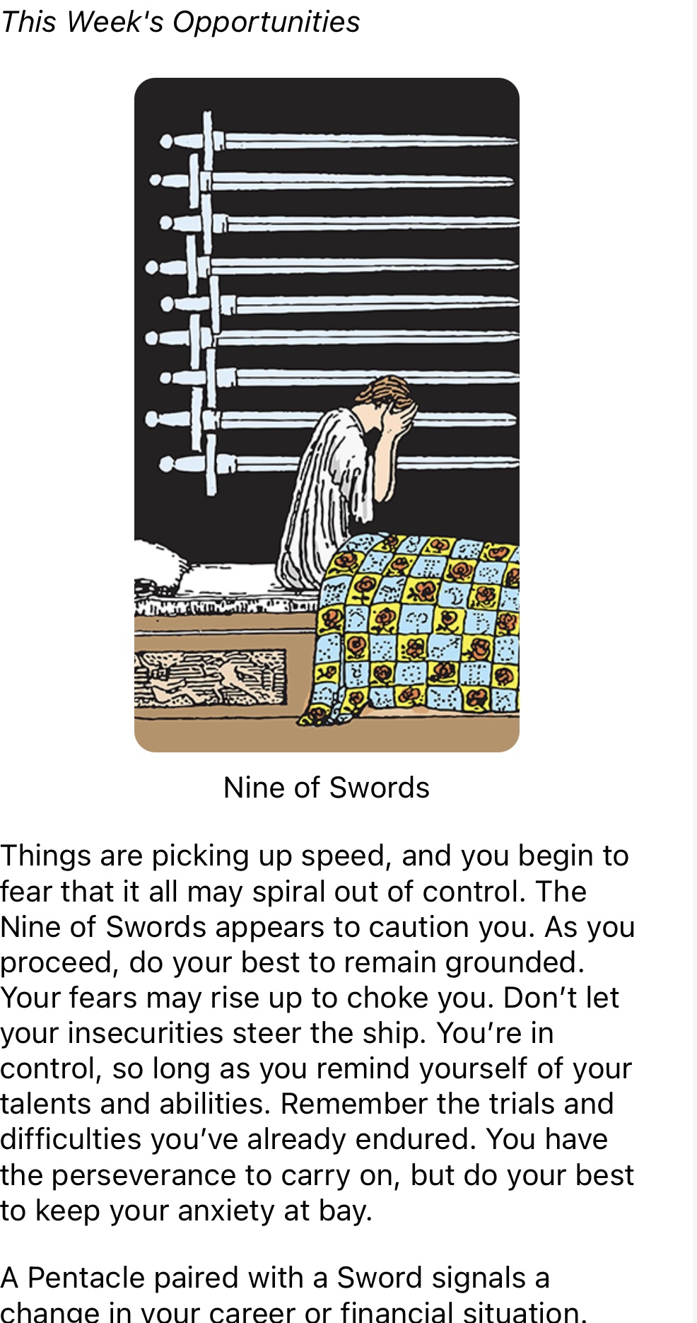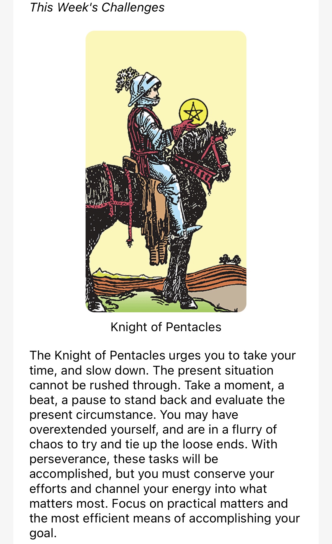 Tarot – knight of pentacles & nine of swords