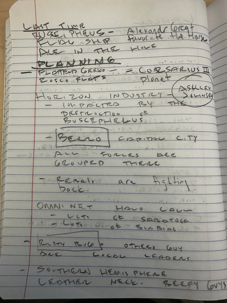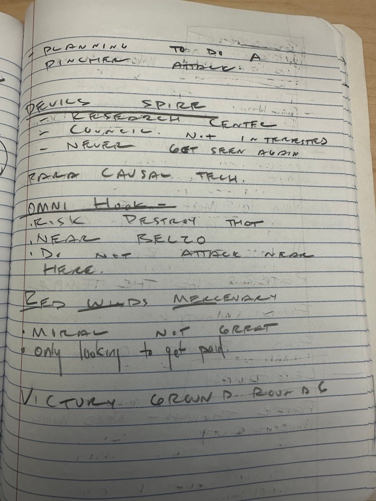 These appear to be session notes or plot reminders for a tabletop RPG (likely VTM extended into a sci-fi setting with elements like planetary conflicts, mercenary companies, research spires, and Arthurian/mythic callbacks—e.g., Bucephalus as Alexander’s horse, possibly reimagined as a ship or asset). Names like “David Chomsky” (perhaps a player character or NPC pun on Noam Chomsky?), “Cody died/mercenary,” “James Freeze Storm” (buddy killed), and “Toraq” suggest ongoing character arcs or deaths from prior sessions. The “comic quest” and “Lancelot” might reference a side plot, in-game comic/book, or Arthurian-themed quest in the chronicle.