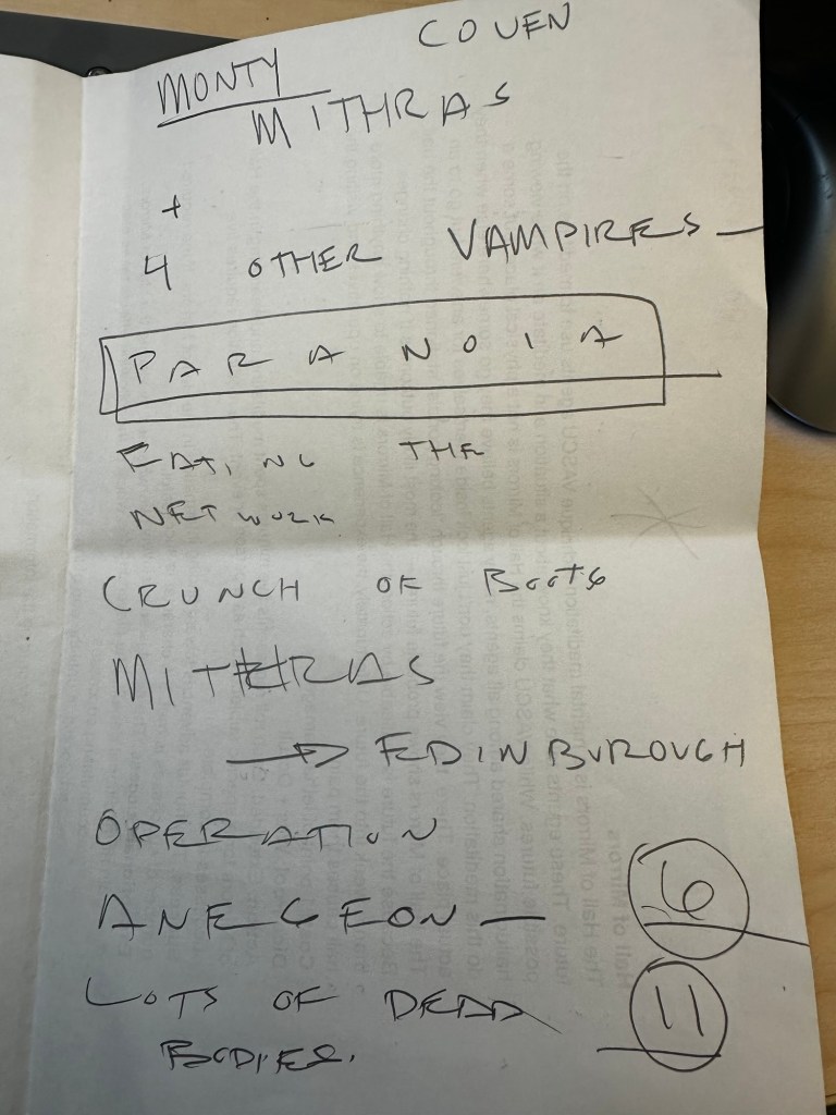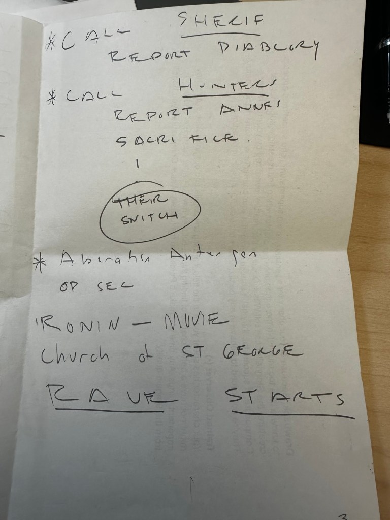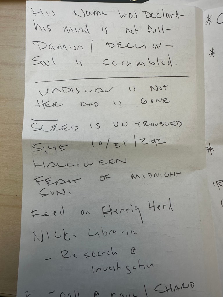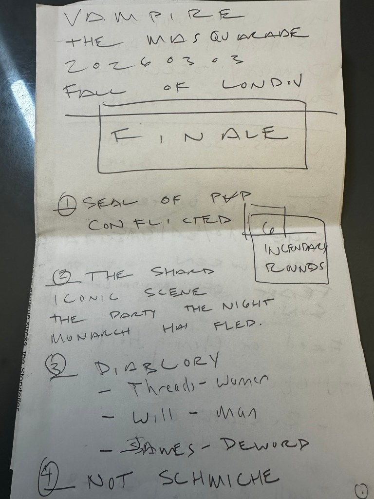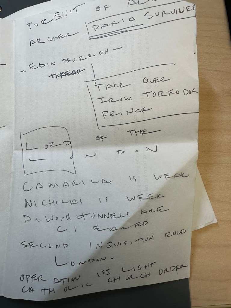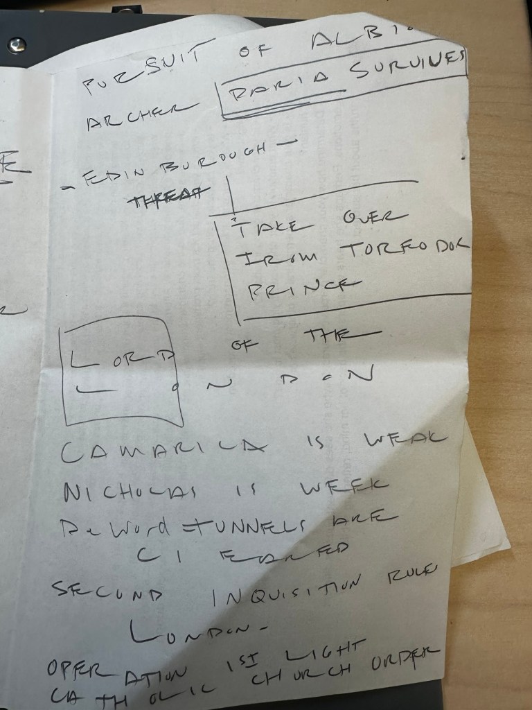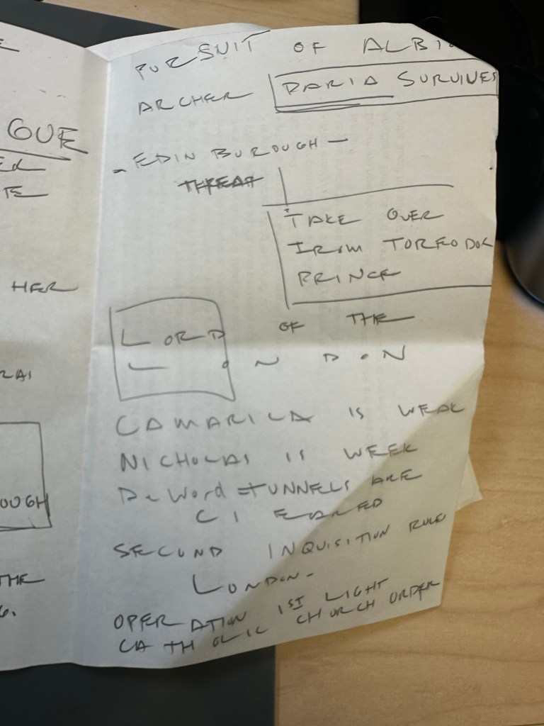 (The pages repeat similar content about pursuit, Daria/Paria surviving, Edwin as threat, takeover from Prince/Torpedo Dock, weak Camarilla/Nicholas, Second Inquisition rules London, Catholic Light Order operation.)