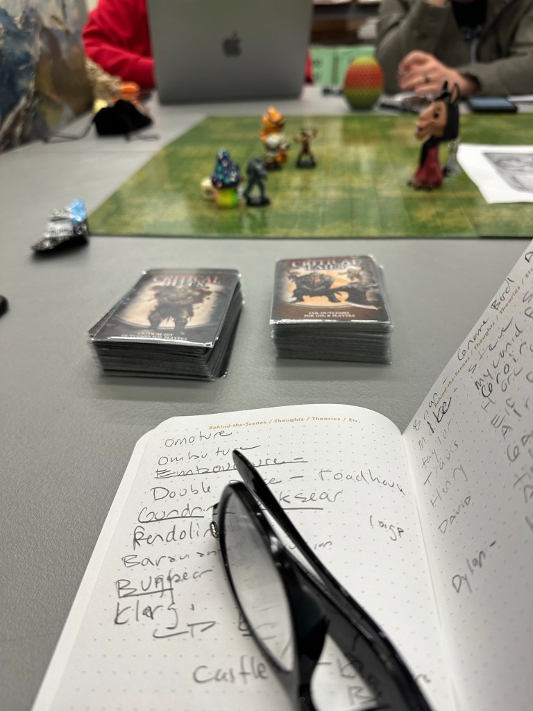 III (Elf Fighter played by Henry) is the Joker’s step brother who watches a lot of YouTube with excellent vision and is into horticulture. Days (Rouge played by Travis) is based on Calendar Man. Honey Bunches of O’s (Paladin played by Taylor) is four years old and working with Penguin yakuza version. Lazorius (Wizard Necromancer multiclass Bard played by Cody) is the Ra’s Al Ghul adjacent league of shadows connected. Ra’s al Ghul. (Wizard Necromancer played by Cody) is just a broken build controlling 12 skeleton warrior in the League of Shadows Snow (Fighter played by Lewis) is mentored by Two-Face. Plated member of the Golden Vault. No name (Cleric played by Matt). Top Card (Rogue played by Glenn) is Cat Women without the slapstick. Filled member of the Golden Vault.