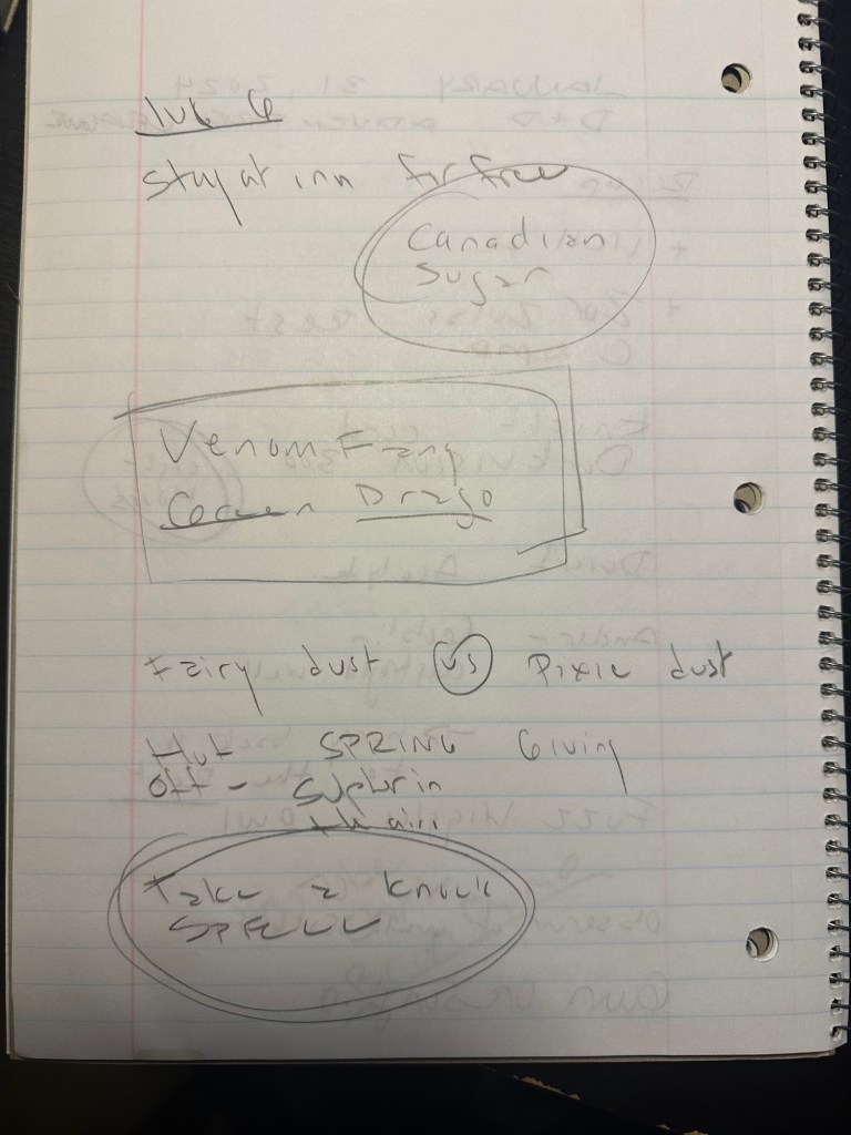Child Dwarven Brandy Key to Hideout Doors Octopus Ink Potion – Climbing Potion – Growth Potion – Healing Potion – Invisibility Scroll – Darkness Scroll – Fireball Scroll – Hold Person Scroll – Lightening Bolt Scroll – Misty Step Scroll – Revify Scroll – Silence Vial of Dragon Bile Vial of Mercury Vile of Nightshade Women – Widow