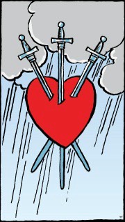 The image is of three swords piercing a heart against a stormy background. Something has been said or done that causes pain – perhaps the revelation of a secret.