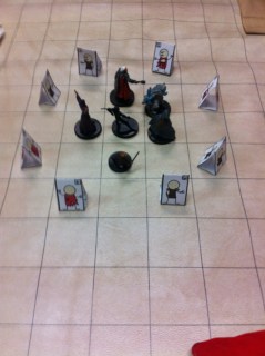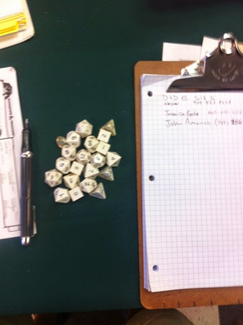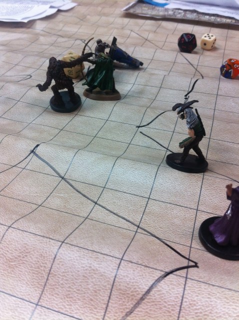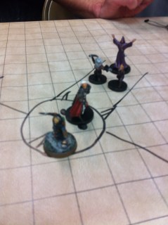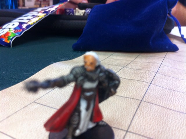 We had a lot of people–Scott, John, Victoria, Jack were on the south sideon the North Side we had Ramin, Bobby, Lisa, and RichardThe shop was crowded–there were lots of Magic players again this week.We had a lot of great rolls & made it through a lot of encounters.I am lugging way to much stuff to the table.But I did have my new Doc character sheet.The mini’s we are using are very nice.Ramin scored first crit.Jack got one on a Arcana check, I think.Ramin got another one.