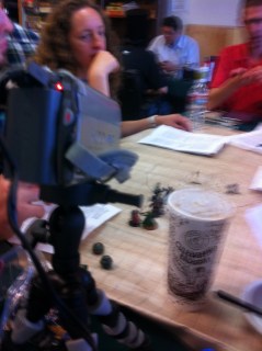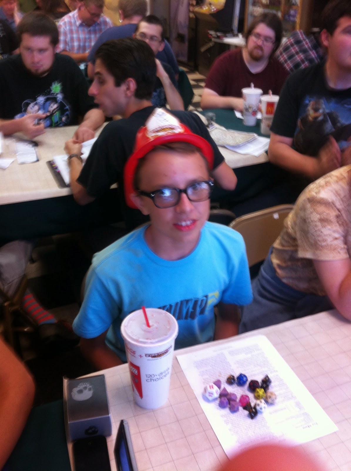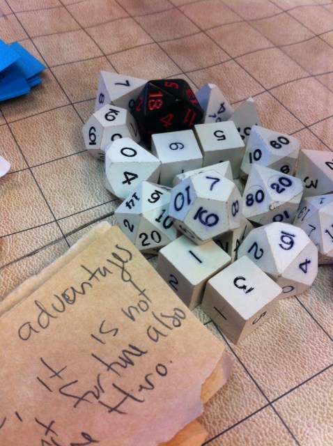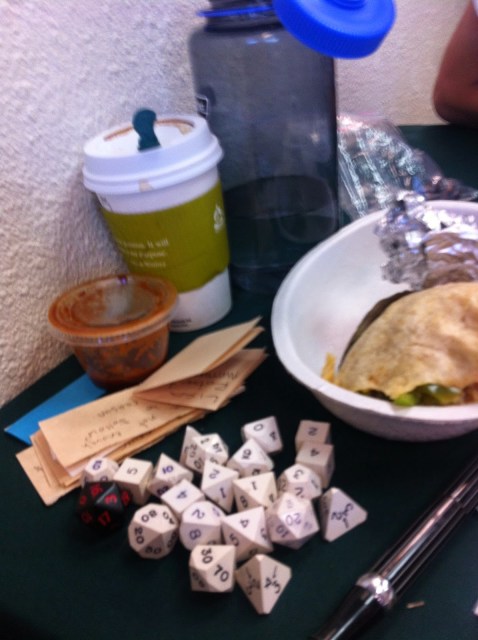 Jack was ready to roll–behind him is Bobby, Ramin, Dude whose name I forgot, maybe Trevor, and Robert–a very solid table!Nathan is new at our table & may be the greatest roll player of all time–this guy is awesome! He was playing a dwaft paladin with a halbard. Hard Core!