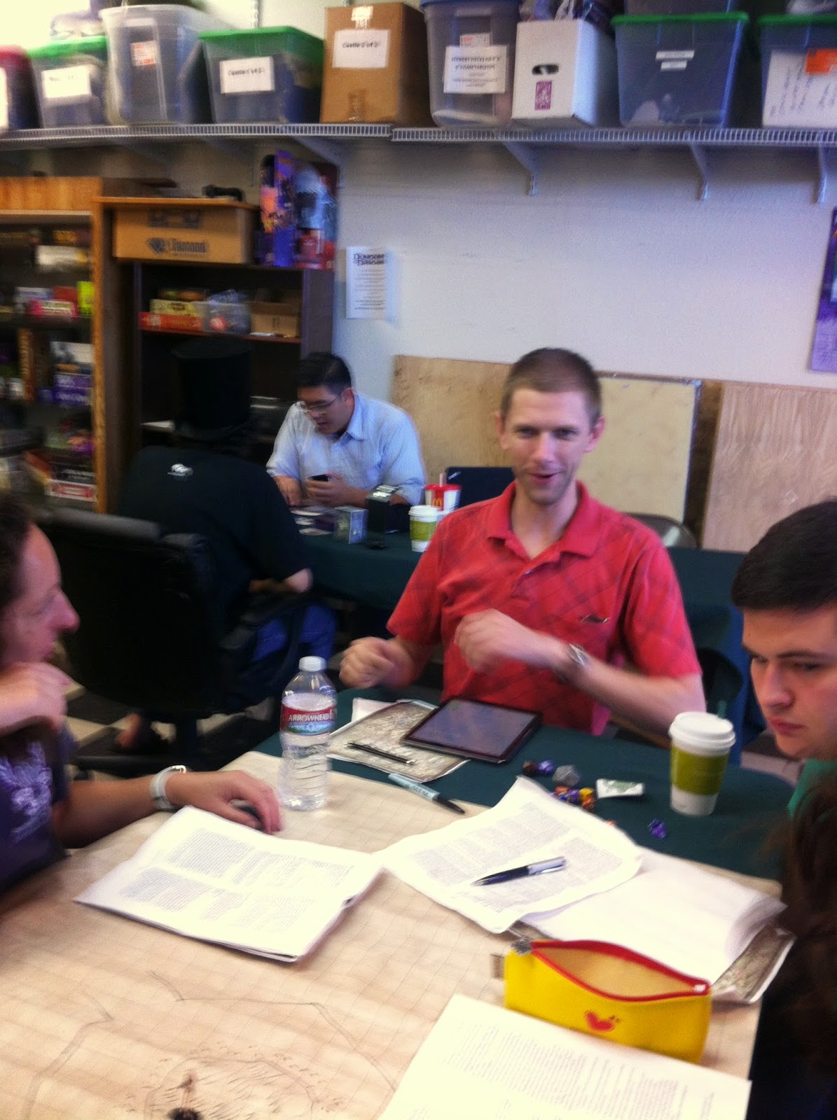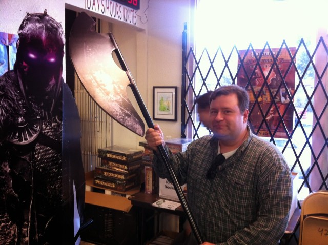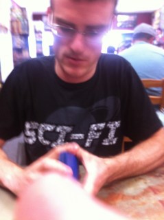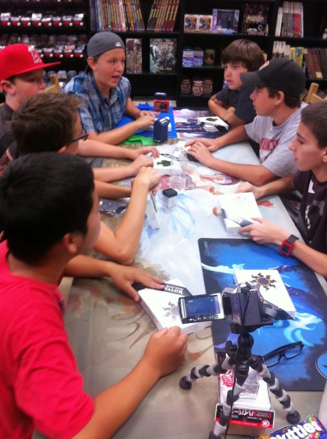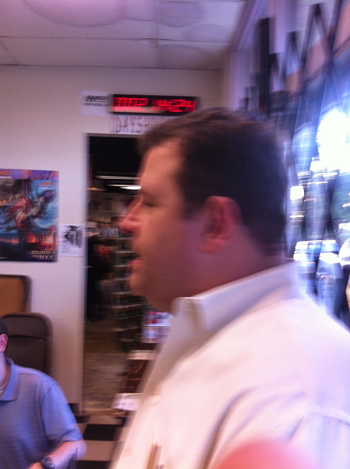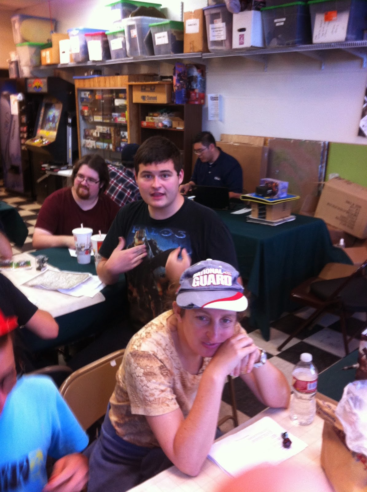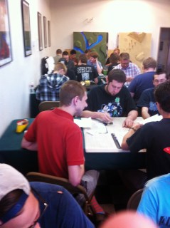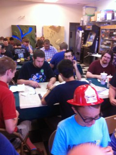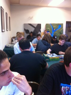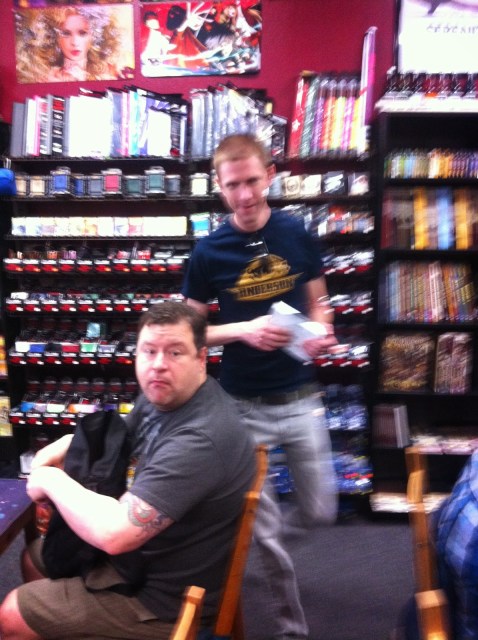 John was still yelling at our table–I think this is on the topic of Halo.The shop is still somewhat crowded with Magic Players.