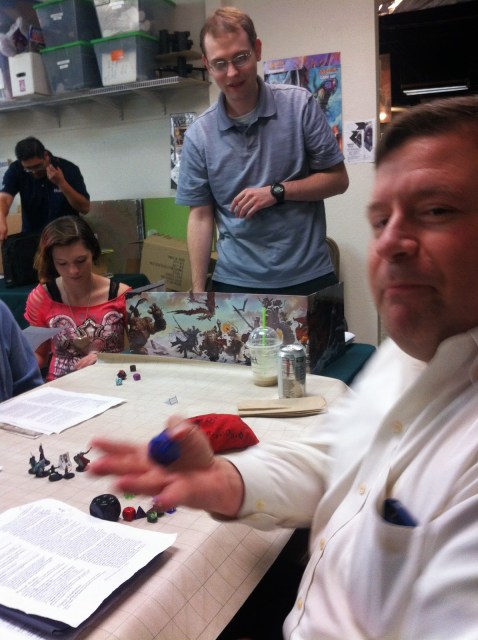 I was on the end, and though I had no chair, I still had plenty of space.There was some interaction between the two tables as we entered the final stages of Dead in Thay–some crazy pyramid crypt thing. -